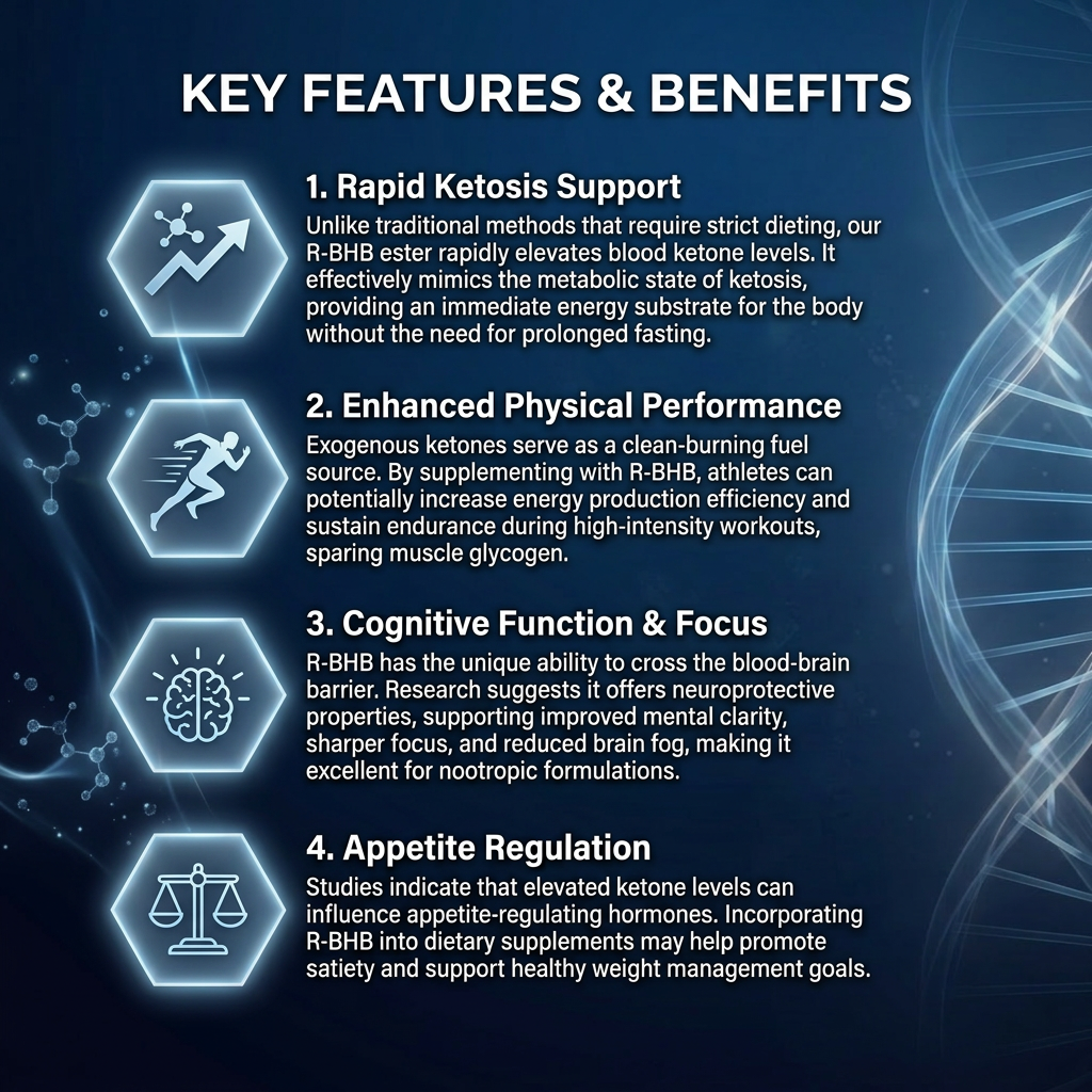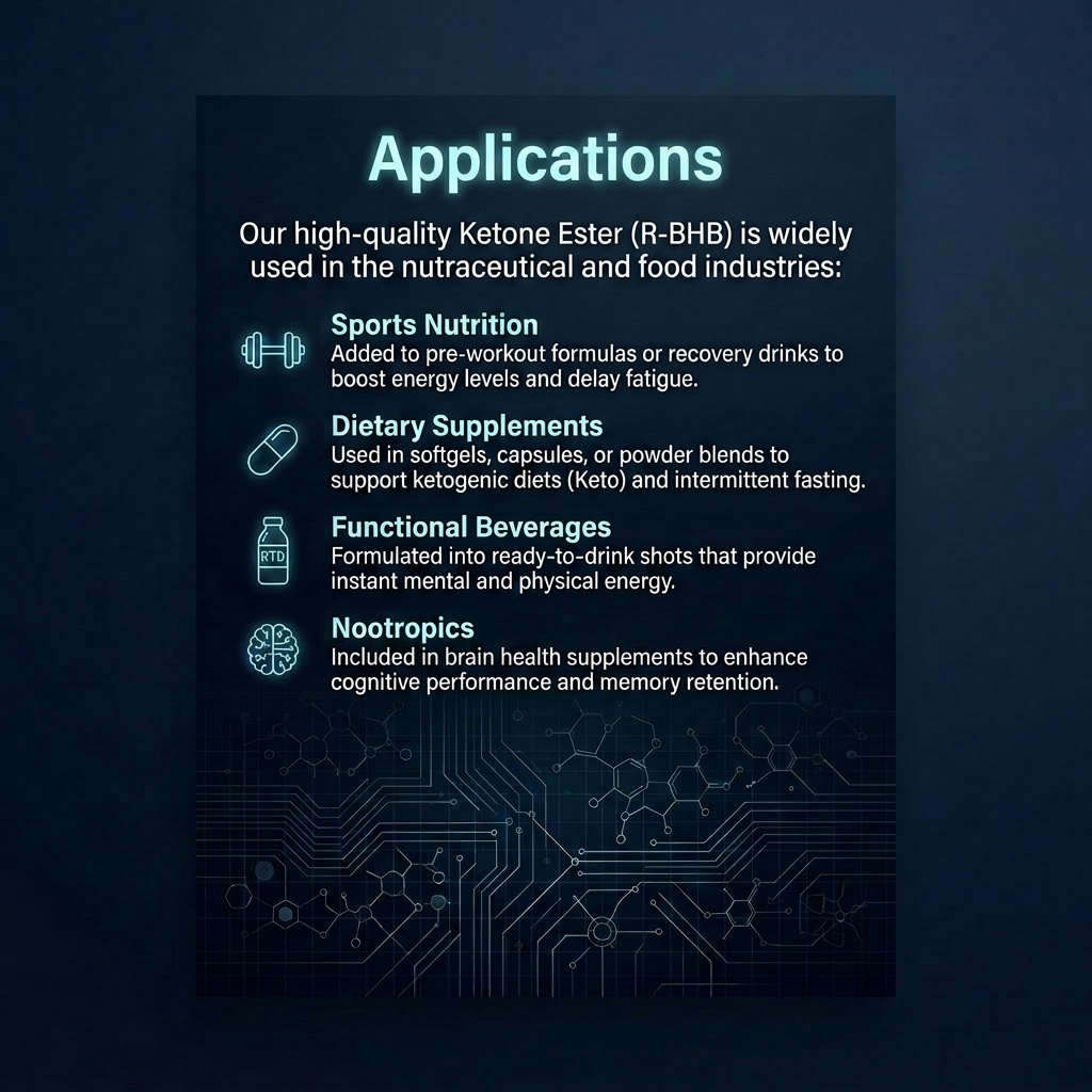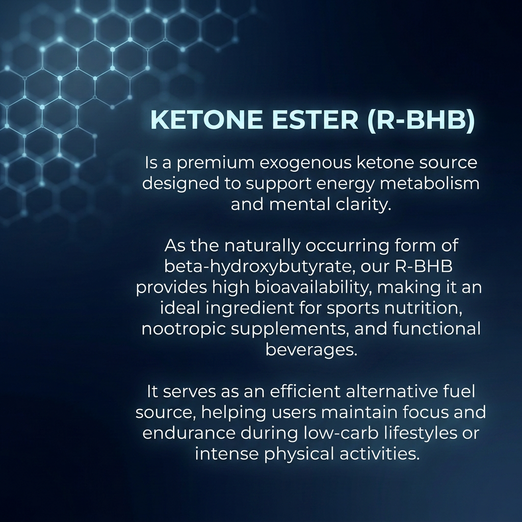 Ketone Ester (R-BHB)is a premium exogenous ketone source designed to support energymetabolism and mental clarity. As the naturally occurring fom of beta-hydroxybutyrats, ourR-BHB provides high bigsvailabilitx making it an ideal ingredient for sports nutri